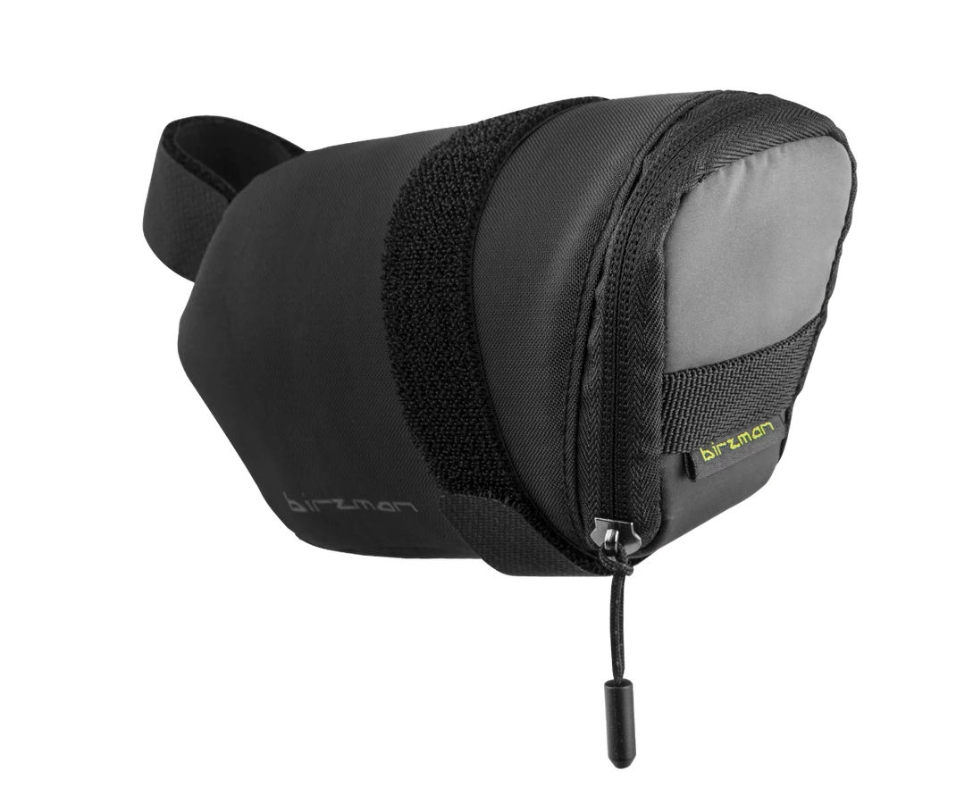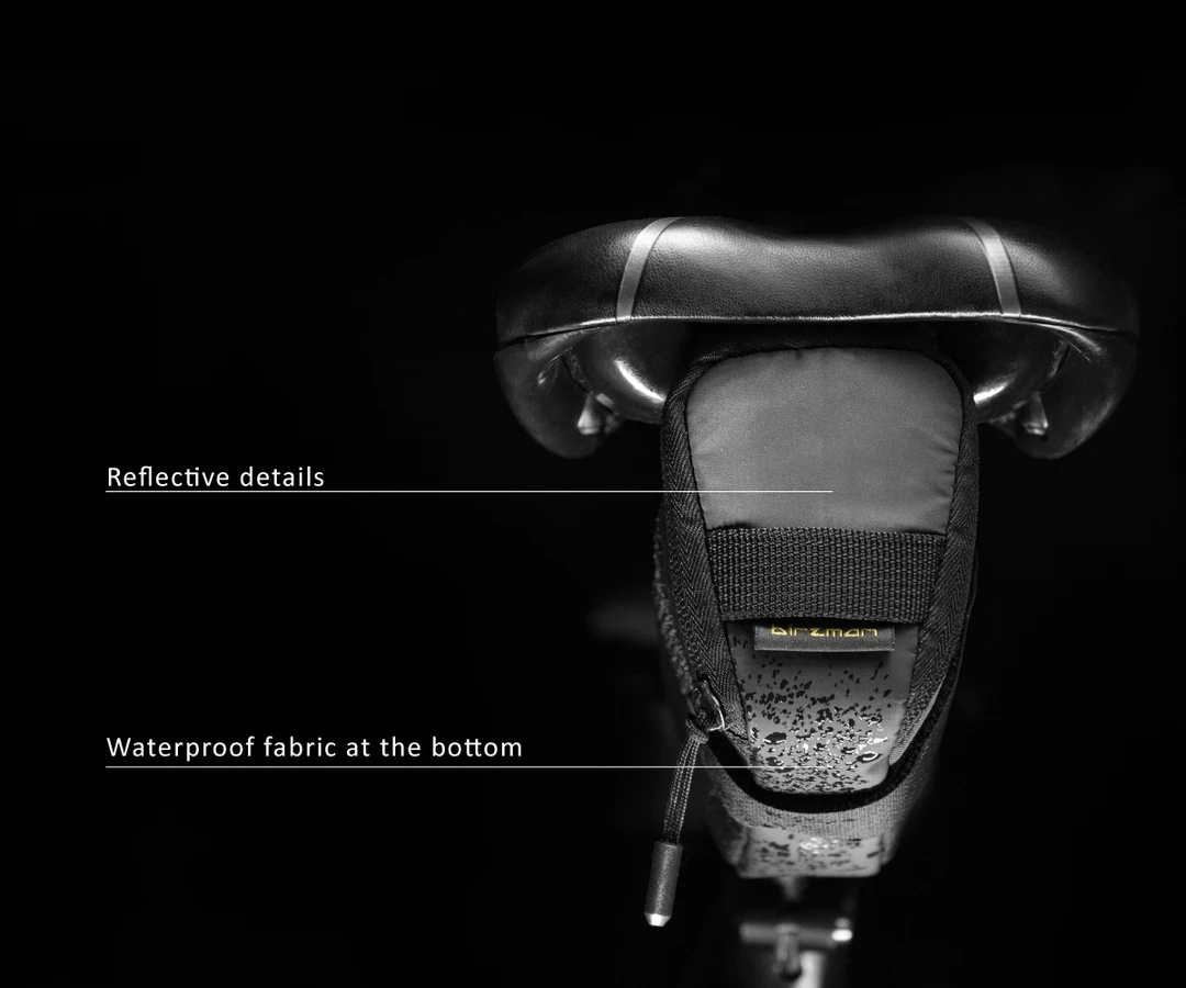 The waterproof fabric at the bottom helps protect contents, and the self-engaging Velcro provides easy attachment onto the seatpost and saddle rail.