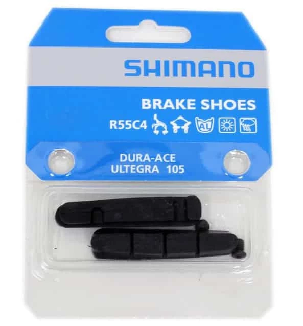 The Shimano R55C4 brake pads (1 pair) for aluminium rims impress with their durability, dry performance and quiet operation. At the same time, they protect the brake track. R55C4 brake pads can be used with current and older Dura-Ace, Ultegra, 105 and group-less Road bike brakes (standard and direct mounting) as well as cantilever brakes.