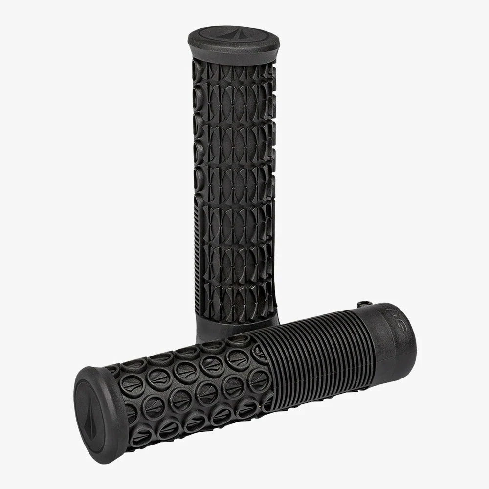 The Thrice grip borrows the same integrated 1 piece clamp and tapered core as our proven Slater grips, which keep both the weight and price down. It’s packed full of technical features and a soft gel compound to ensure complete bar control and ultimate comfort. First, we utilized a half mushroom profile for palm comfort. Next, we added our proven circular icon dampeners to disperse shock and vibrations. And finally, we incorporated our ramped and undercut saddle icon to aid in finger traction, which reduces any hand slippage in the toughest conditions. The Thrice has an ovalized shape and is offered in two different diameters to ensure the right fit for your hands.