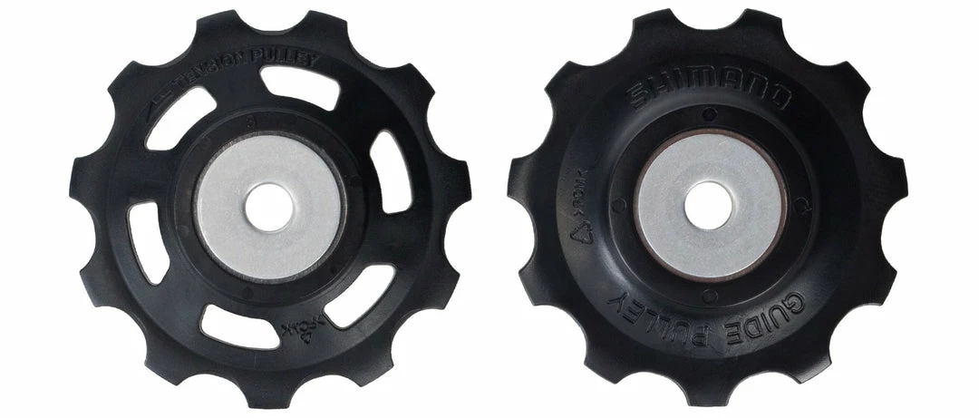 If your Shimano Dyna-Sys 10-speed mountain bike drivetrain features these specific rear derailleurs: M786, M781, M780, or M773, this genuine XT-level Derailleur Pulley Set is the proper replacement for your original equipment. This advanced grade pulley set has some specific features that work for the listed derailleurs and may not be an upgrade for other, unlisted models. First, you should know that Shimano has made a running change to the replacement set so that it works best with all listed models. In the original RD-M773 cage, both the 11T Guide and Tension pulleys were the same. This set has specific 11T Guide and Tension pulleys but works perfectly. The Guide pulley is the solid version, and is clearly labeled. The Tension pulley has cut outs, which offer improved mud shedding in this less protected zone. Follow the marked directional arrows at installation, as each unit is also directional. A close examination shows the bevels and shapes of the pulley teeth which are designed to engage the chain properly, offer retention and function, while reducing system friction.