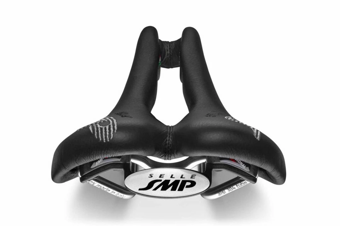 The patented features by Selle SMP, such as the completely free central channel, the original eagle-beak nose and the raised rear give these models an interesting aerodynamic touch. The width of the central channel permits optimal aeration of the genitalia normally in contact with the seat. The pelvic viscera are housed in the central channel of the seat, with a width up to 5 cm, and do not undergo any compression, permitting complete and constant natural blood flow. There is a dip in the back part of the seat that prevents the coccyx from touching the seat, avoiding repercussions caused by rough terrain.