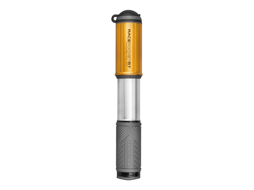 Our fattest version in the RaceRocket® series this all aluminum mountain pump gets big volume tires up to pressure fast. This elegant little mini pump features a full aluminum body, head and pump handle and is designed with an increased barrel diameter to push more air per stroke. An extendable hose with SmartHead® ThreadLock fills Presta and Schrader valves with ease and helps take stress off the valve stem when filling the tire. Its efficient and smooth action inflates tires to 90 psi / 6 bar. Compact in size it easily fits in a jersey pocket or saddle bag and with a low weight of only 114 g the RaceRocket® MT is never a burden to carry into the backwoods. Note : Use the PCT Cap to tighten or remove two piece Presta valve cores when necessary.